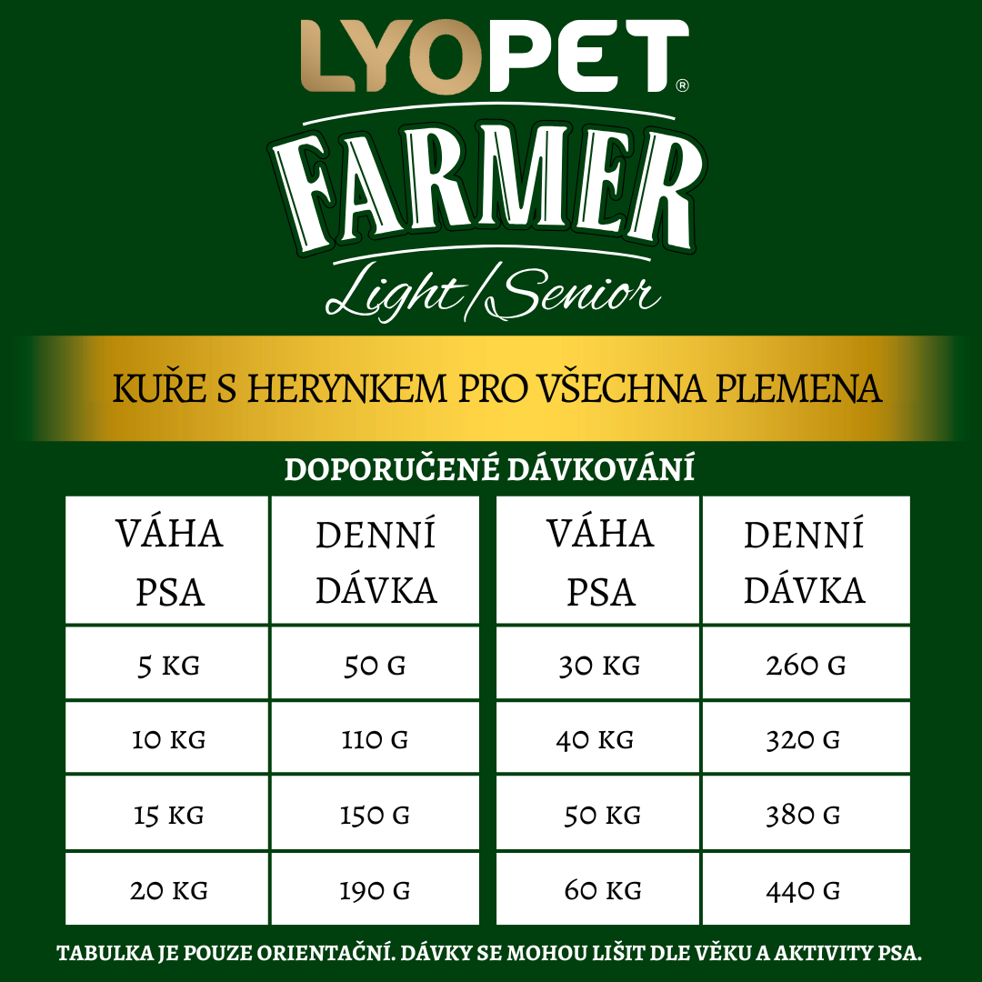 Lyopet Farmer Light je kompletní superprémiové krmivo speciálně navržené pro psy seniory a pro psy s nadváhou. Obsahuje masové psí granule, šetrně zpracované za nízkých teplot, obalené v mase sušeném mrazem, arktickém krillu a v BIO kolostru. Dietní granule pro psy s vysokým obsahem masa, bez chemie a konzervantů.