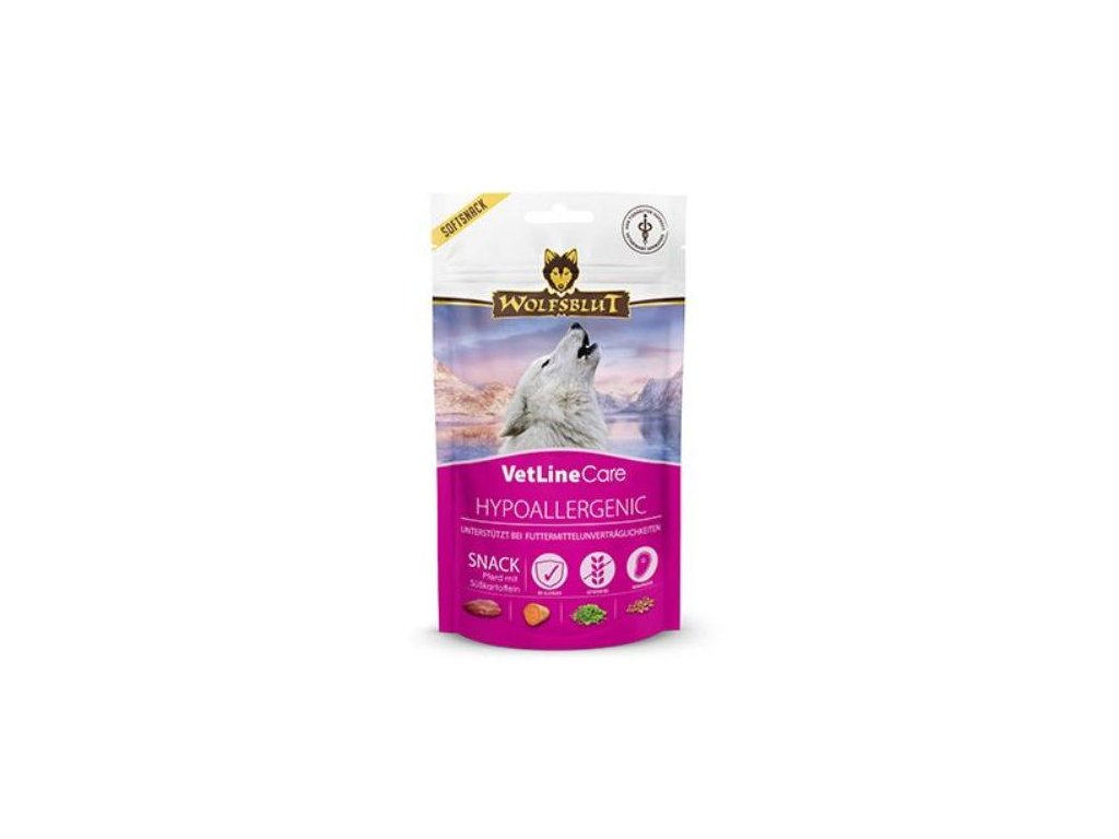 VetLine HYPOALLERGENIC Měkký hypoalergenní snack s koňským masem, lněným semínkem a řasami pro mazlíčky s intolerancemi. Jemné složení bez obilovin a zbytečných přísad šetří zažívání a potěší i mlsné jazýčky.