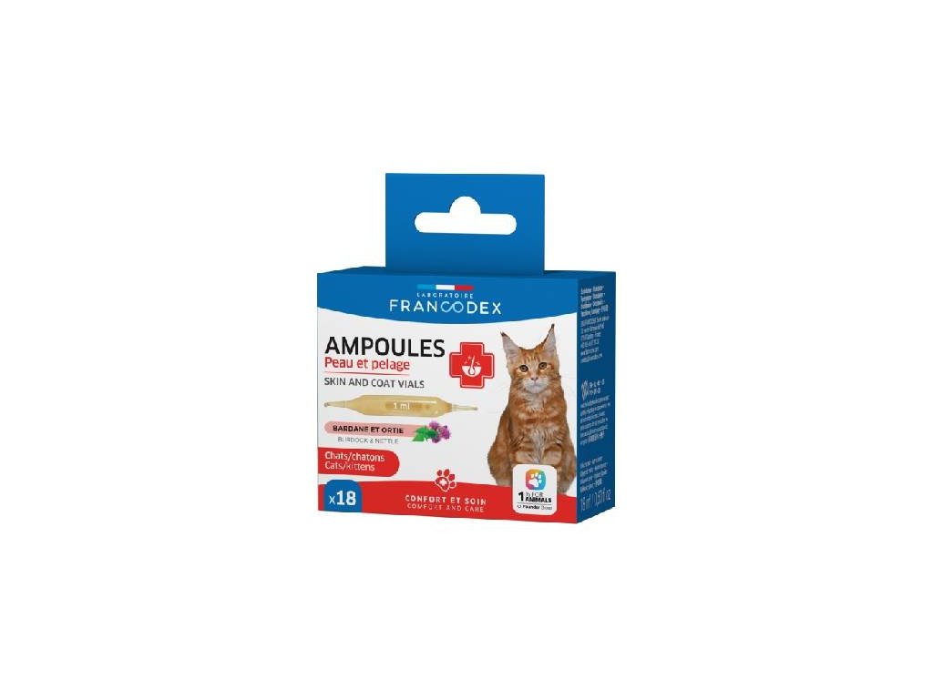 Ampulky SKIN AND COAT jsou speciálně navrženy tak, aby podporovaly zdraví kůže a krásnou srst koček a koťat, obsahují rostlinné extrakty (lopuch, kopřiva) v kombinaci s paraprobiotiky a postbiotiky, které napomáhají zdravé regeneraci kůže vašeho mazlíčka a zároveň posilují jeho přirozenou trávicí flóru.